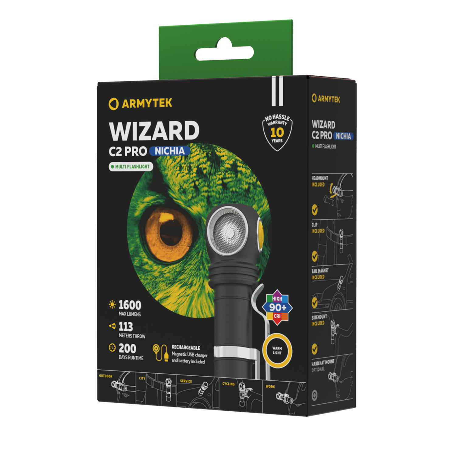 Dzięki bogatym akcesoriom, mocowaniu na głowę, klipsem, magnesem w tylnej pokrywie i uchwytem rowerowym ABM-01, wielofunkcyjna latarka 3 w 1 nadaje się do zajęć na świeżym powietrzu, uprawiania sportu, wędkowania, polowania, konserwacji samochodów i serwisy. Wizard C2 Pro Nichia jest kompatybilna z mocowaniem do kasku AHM-02 i może być używana jako główne źródło światła podczas prac budowlanych.