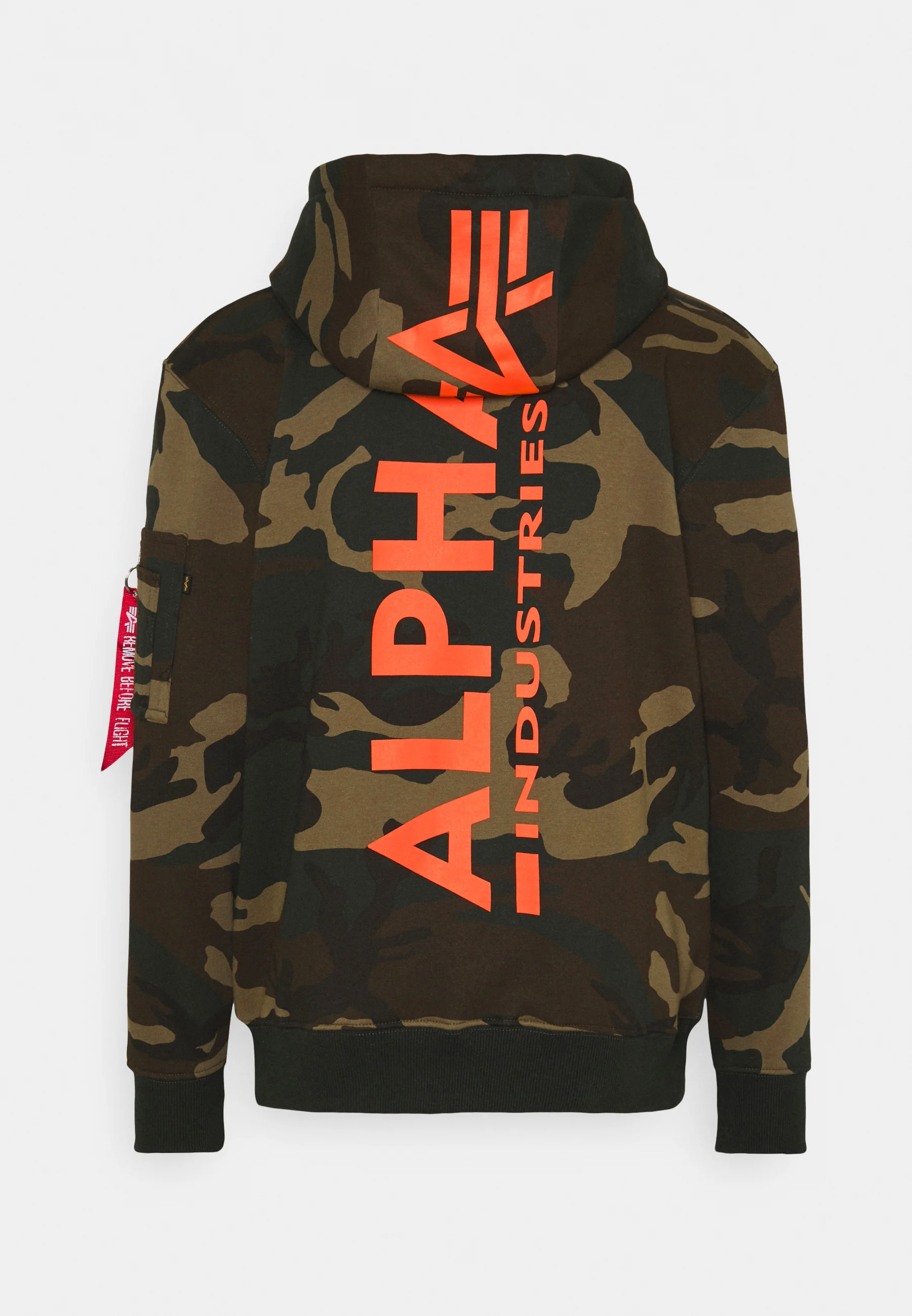 Bluza Alpha Industries Back Print Hoody Black Camo to kangurka wkładana przez głowę, kaptur zakończony sznurkami, z naszywką na piersi, logo na plecach, z kieszonką na ramieniu zapinaną na zamek z taśmą "Remove Before Flight"