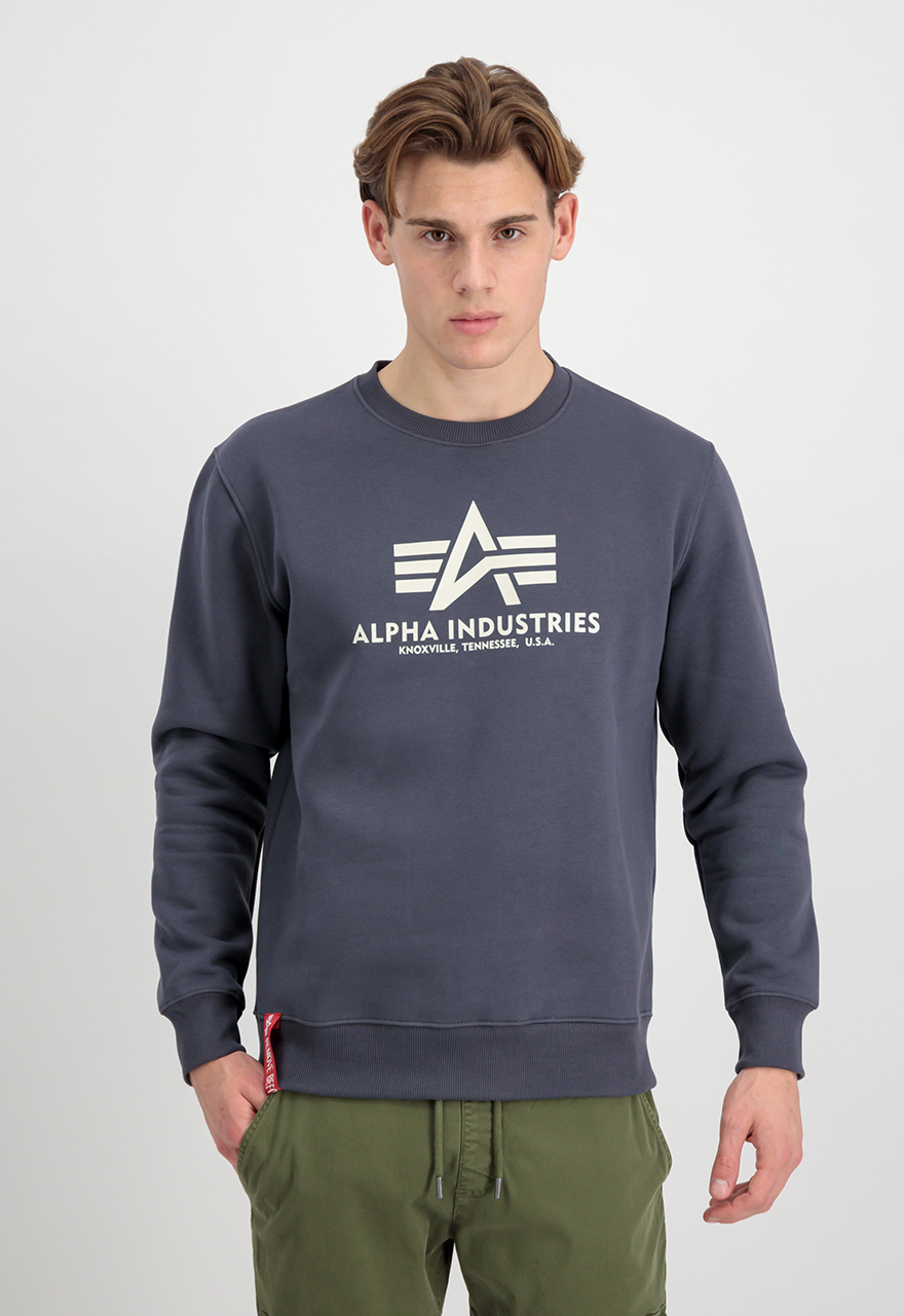 Bluza Alpha Industries Basic Sweater to klasyczny model z logo producenta na przodzie, po prawej stronie na ściągaczu czerwona taśma z napisem "Remove Before Flight"