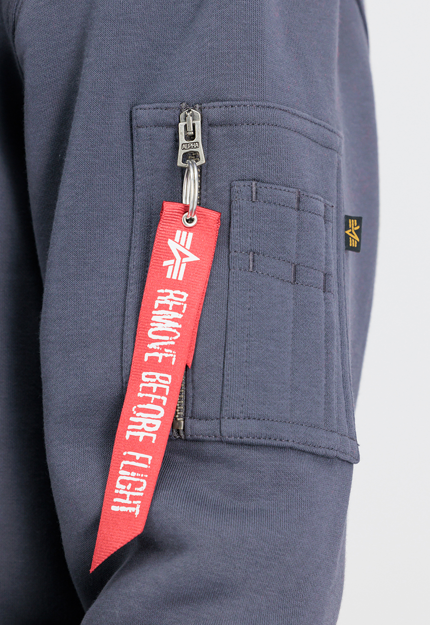 Bluza ALPHA INDSUTRIES Reflective Hoody Grey Black to bawełniana bluza kangurka z nadrukiem na przodzie, posiada kieszonkę na ramieniu zapinaną na metalowy zamek.