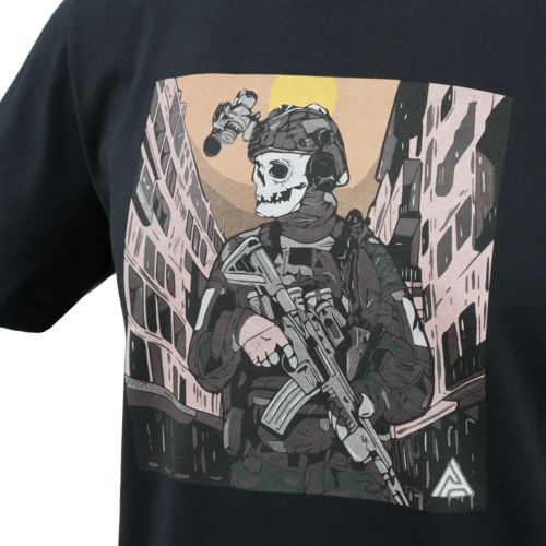 T-shirt ze szkieletem w oporządzeniu taktycznym i zrujnowanym miastem w tle.