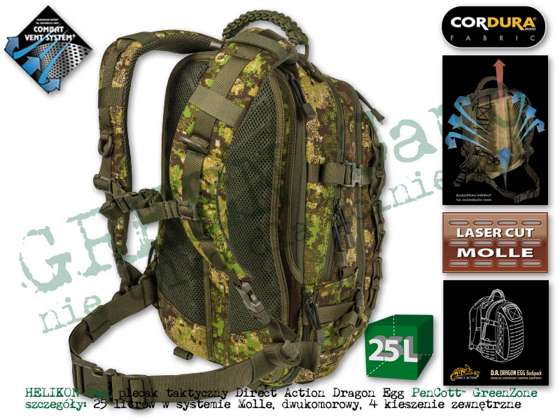 Direct Action® Dragon Egg® to 25-litrowy patrolowy plecak, który sprawdzi się również w codziennym użytkowaniu. Posiada dwie kieszenie na wkłady hydracyjne, jedną w komorze głównej i dodatkową w zamykanej kieszeni tylnej, która, dzięki specjalnemu rękawowi może być, z powodzeniem wykorzystywana do bezpiecznego przenoszenia radiostacji lub 15'' laptopa. Przednia kieszeń, zbliżona wielkością do komory głównej, posiada prosty organizer i kieszeń siatkową. Boczne kieszonki umożliwiają przenoszenie płaskich i mały przedmiotów, a po otwarciu zamka zwiększają swoją obojętność. Direct Action® Dragon Egg® został pokryty wycinanym laserowo systemem kompatybilnym z MOLLE/PALS. Dzięki swojemu kształtowi plecak ma mniejsze wymiary niż plecaki o podobnej pojemności przez co znacznie ułatwia pracę z kamizelkami balistycznymi i oporządzeniem na pasie. System nośny plecaka został wyposażony w wewnętrzne usztywnienie pleców oraz miękkie, wygodne szelki.