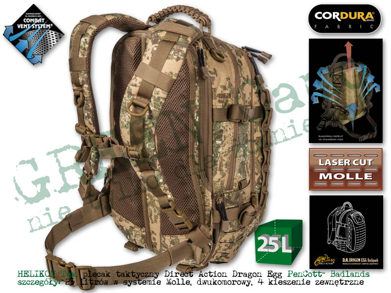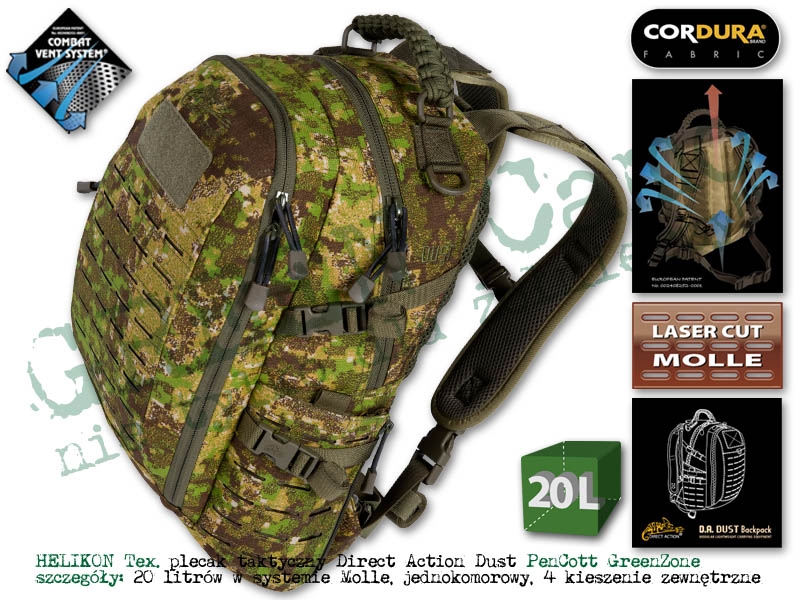 Direct Action® Dust® to 20-litrowy plecak, który sprawdzi się w codziennym użytkowaniu jak i w podstawowych zadaniach taktycznych, gdzie nie jest wymagana duża pojemność plecaka. Komora główna posiada kieszeń siatkową i na wkłąd hydracyjny, która dzięki specjalnemu rękawowi może być, z powodzeniem wykorzystywana do bezpiecznego przenoszenia radiostacji lub 15'' laptopa. Wkład hydraycjny może zostać również umieszczony w dodatkowej kieszeni tylnej. Przednia kieszeń posiada organizer i przezroczystą kieszeń na mapę. Boczne kieszonki umożliwiają przenoszenie płaskich i małych przedmiotów, a po otwarciu zamka zwiększają swoją obojętność. Direct Action® Dust® został pokryty wycinanym laserowo systemem kompatybilnym z MOLLE/PALS. System nośny plecaka został wyposażony w wewnętrzne usztywnienie pleców oraz miękkie, wygodne szelki.
