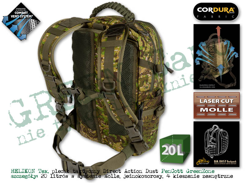Direct Action® Dust® to 20-litrowy plecak, który sprawdzi się w codziennym użytkowaniu jak i w podstawowych zadaniach taktycznych, gdzie nie jest wymagana duża pojemność plecaka. Komora główna posiada kieszeń siatkową i na wkłąd hydracyjny, która dzięki specjalnemu rękawowi może być, z powodzeniem wykorzystywana do bezpiecznego przenoszenia radiostacji lub 15'' laptopa. Wkład hydraycjny może zostać również umieszczony w dodatkowej kieszeni tylnej. Przednia kieszeń posiada organizer i przezroczystą kieszeń na mapę. Boczne kieszonki umożliwiają przenoszenie płaskich i małych przedmiotów, a po otwarciu zamka zwiększają swoją obojętność. Direct Action® Dust® został pokryty wycinanym laserowo systemem kompatybilnym z MOLLE/PALS. System nośny plecaka został wyposażony w wewnętrzne usztywnienie pleców oraz miękkie, wygodne szelki.