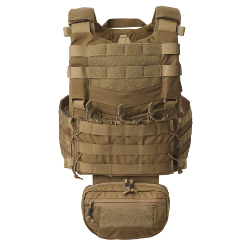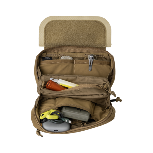 Pojemna kieszeń na akcesoria taktyczne Kieszeń Guardian Dangler to podwieszana kieszeń do kamizelki Guardian Plate Carrier. Pozwala na przenoszenie dodatkowego wyposażenia jak pakiet medyczny narzędzie wielofunkcyjne itp. Wewnątrz kieszeni znajduje się wszyty na stałe organizer pozwalający na łatwe posegregowanie przenoszonego wyposażenia. Dangler mocowany jest do plate carriera pod klapą przednią za pomocą demontowanego panelu z rzepem. Guardian Dangler może być również zmieniony w nerkę za pośrednictwem dopinanego paska biodrowego. Cechy: Wewnętrzna kieszeń zapinana na suwak Panel do personalizacji