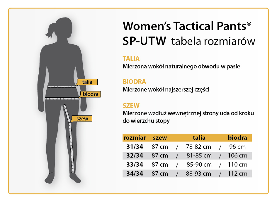 Women's UTP® zostały zaprojektowane dla żeńskich operatorów. UTP® to podstawowy element serii Urban Tactical Line®. Zastosowany krój i ułożenie kieszeni sprawiają, że spodnie UTP® zachowują cywilny wygląd, nie zdradzając tożsamości użytkownika. Konstrukcja UTP® umożliwia przenoszenie istotnego oporządzenia oraz współpracuje z anatomią ruchu człowieka. Zestaw kieszeni pozwala na ułożenie ekwipunku blisko środka ciężkości - wokół bioder i pasa użytkownika. Zastosowany, elastyczny materiał wpływa to na łatwość i szybkość poruszania się w warunkach taktycznych.