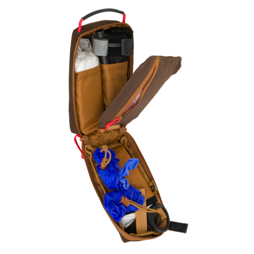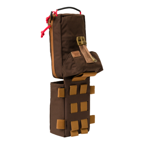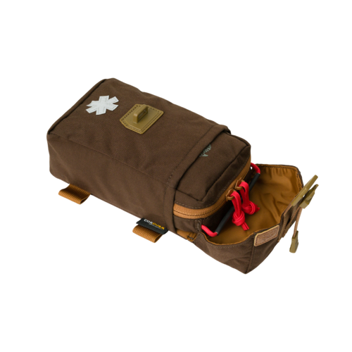 Apteczka bushcraftowa niezbędna w terenie Nasza apteczka bushcraftowa została sprofilowana pod pierwszą pomoc w sytuacjach, które najczęściej przytrafiają się podczas aktywności bushcraftowych, np. pracy z piłą, z siekierą, podczas częstego używania noża. Nowym rozwiązaniem jest miejsce na stazę wewnątrz apteczki, a nie na zewnątrz, jak jest zazwyczaj. Takie rozwiązanie wynika ze specyfiki aktywności bushcraftowych. Apteczka Bushcraft First Aid Kit składa się z prostokątnego pokrowca ze sztywnymi plecami. Wewnątrz jest wyjmowany insert z uchwytem i możliwością szybkiego otwarcia. Insert można też przenosić samodzielnie. Wewnątrz ma kieszenie na opaskę uciskową, opatrunek osobisty i bandaż. Na samym środku insertu jest zamykana, wypinana kieszeń z elastycznego materiału. Dodaliśmy montaż za pomocą taśm w systemie MOLLE/PALS oraz szeroką taśmę, dzięki której apteczkę można przenosić na każdym pasie o szerokości do 50 mm. Apteczkę da się też przenosić zamontowaną poziomo dzięki klamrom Woojin w taki sposób, jak torbę Foxhole. Cechy: zaprojektowana do bushcraftu wewnętrzna kieszeń na stazę wiele możliwości montażu taśmy MOLLE/PALS wypinane inserty