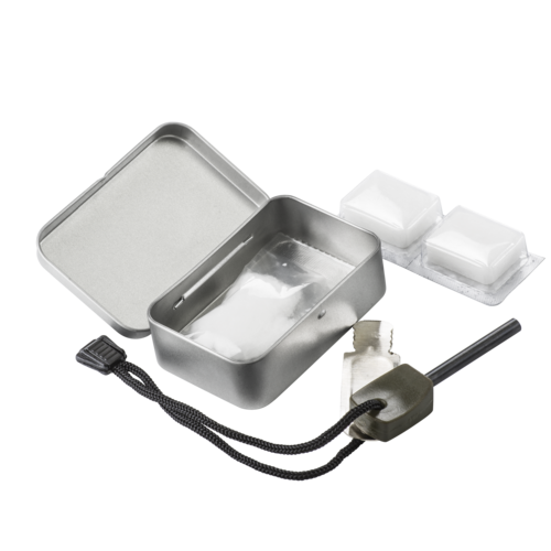 Produkt zawiera: stalową puszkę survivalową o wymiarach 93 x 62 x 27 mm, krzesiwo z iskrownikiem, dwie tabletki z paliwem oraz watę