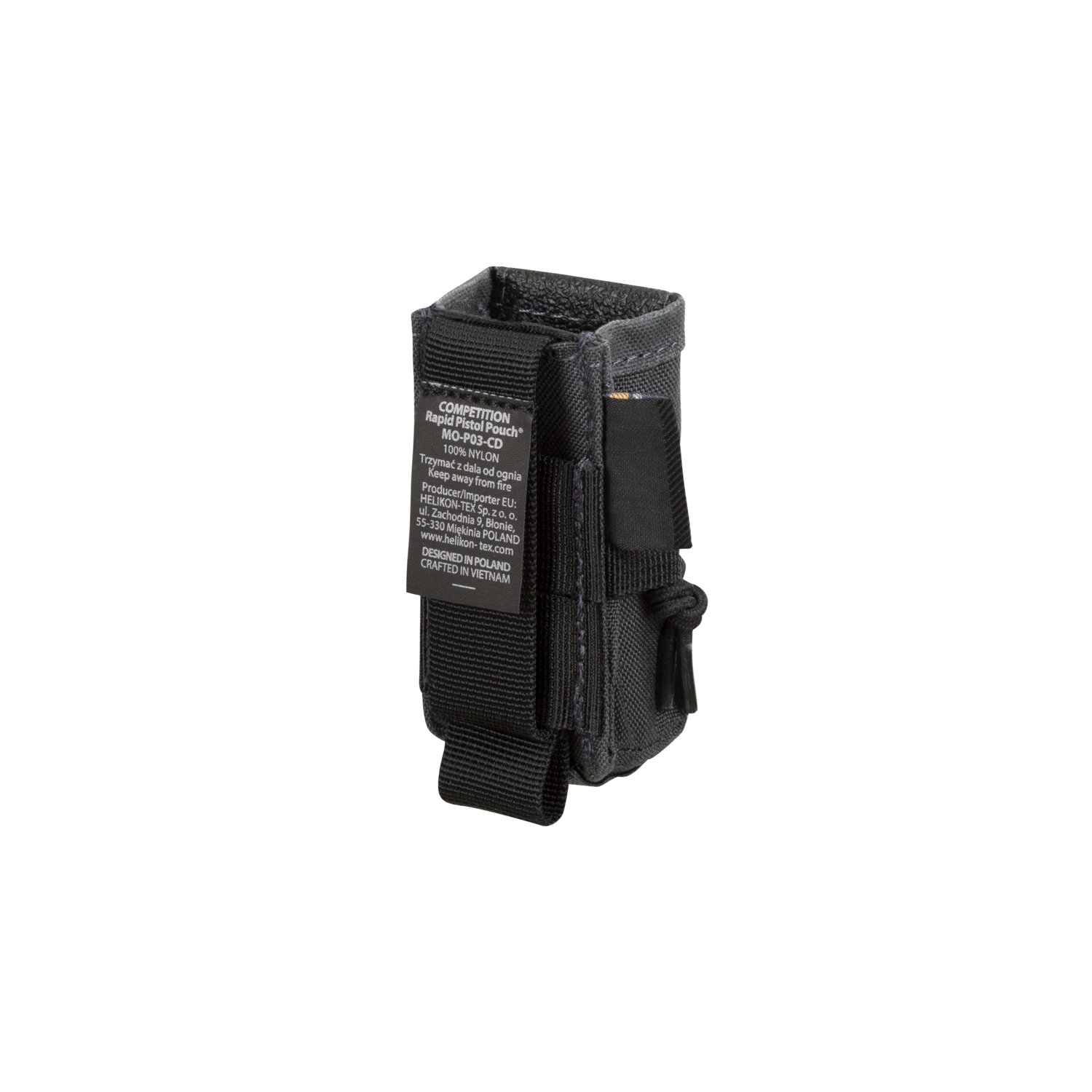 COMPETITION Rapid Pistol Pouch® to część zestawu COMPETITION. Kieszeń zaprojektowana została do przenoszenia pojedynczego magazynka pistoletowego. Jest częściowo usztywniona, aby ułatwić ponowne umieszczenie magazynka w kieszeni. Ładownica jest kompatybilna z systemem MOLLE/PALS, ale może być również zamontowana na pasie o szerokości do 50 mm. Elastyczna guma w okolicy środka kieszeni zapobiega wypadaniu magazynków nawet w trakcie dynamicznych ruchów.