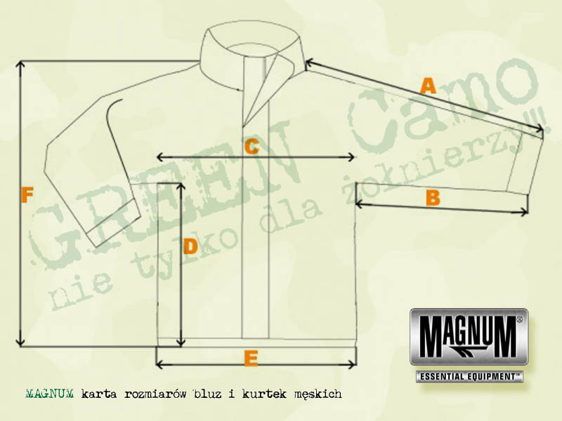 | Rozmiar: | Szerokość mierzona pod pachami (cm) C: | Długość mierzona od pachy (cm) D: | Długośc mierzona od kołnierza z tyłu bluzy (cm) F: | Szerokość na dole bluzy (cm) E: | Długość rękawa mierzona od pachy (cm) B: |
