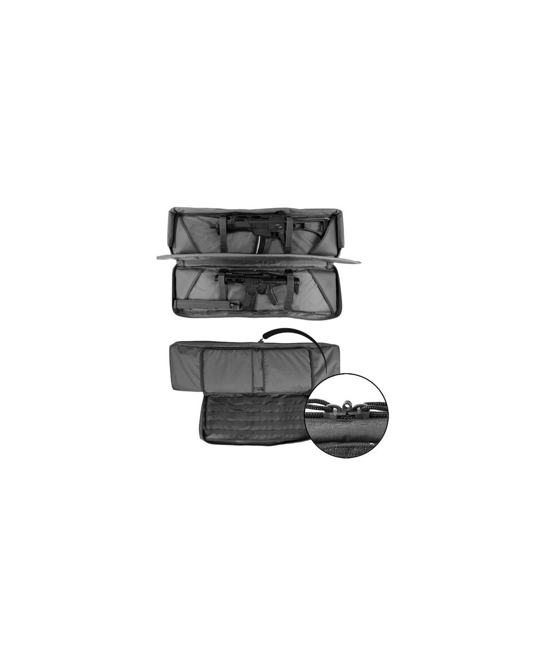 MIL-TEC Sturm pokrowiec na broń podwójny Rifle Case Black - wyściełany futerał na broń na 2 długie i 2 krótkie pistolety- długą broń można zamocować w głównej kieszeni za pomocą dwóch pasków z rzepami- mała kieszeń z dwiema kieszeniami zapinanymi na rzep na broń krótką- wewnętrzna część małej kieszeni z systemem molle- 3 kieszenie zapinane na zamek, wycinane laserowo- kieszeń na zamek błyskawiczny pośrodku z powierzchnią z haczykiem i pętelką do mocowania łatek- kieszeń główna i mała kieszeń wyposażone są w zamykany dwukierunkowy zamek błyskawiczny- odpinany pasek na ramię- odpinane szelki plecaka z paskiem piersiowym- futerał na broń może służyć również jako mata strzelecka