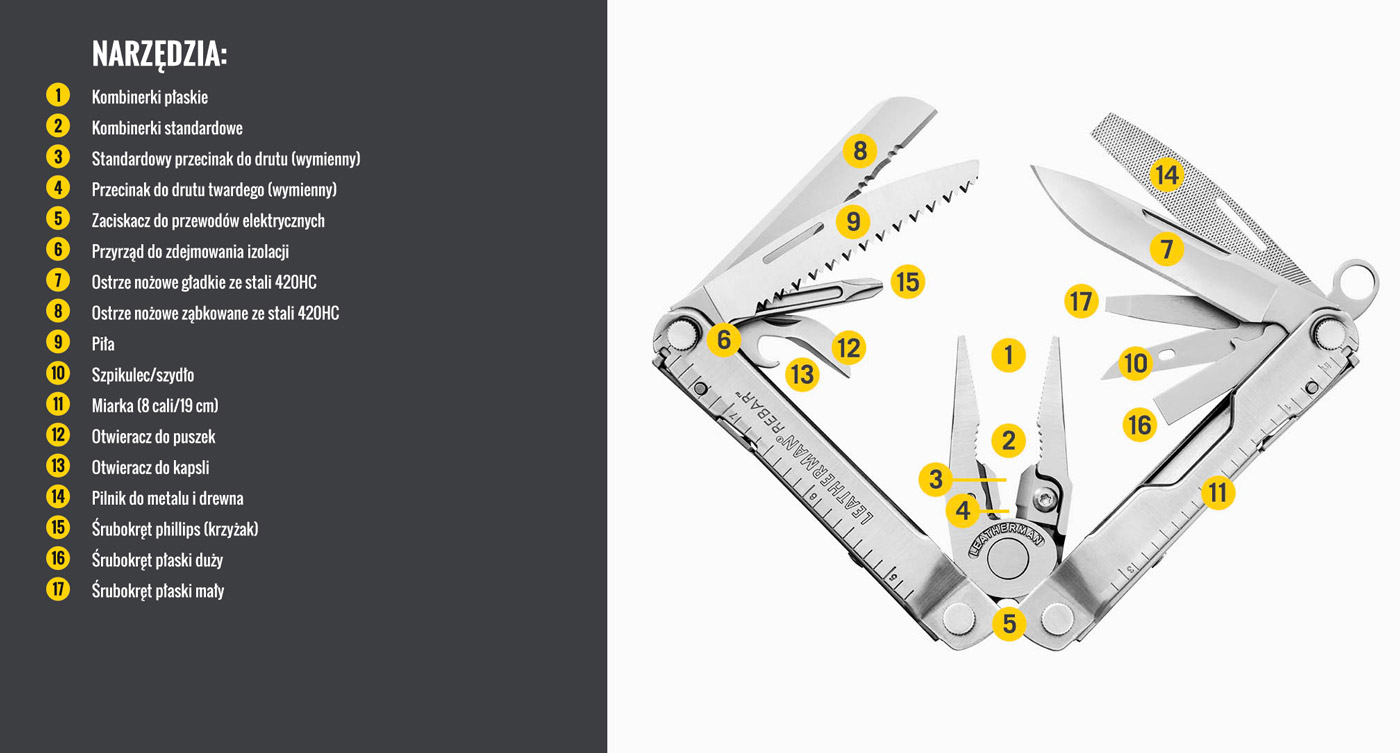 Leatherman Rebar to kompaktowa wersja modelu multitool'a SuperTool 300, w której pomniejszono jedynie długość ramion kombinerek i ostrzy.