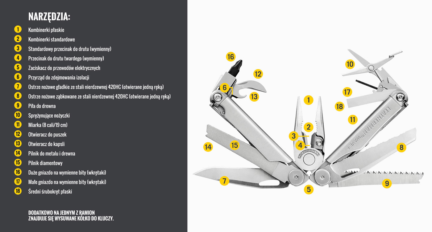 W komplecie znajduje się kabura zapinana na zatrzask, a na jednym z ramion znajduje się wysuwane kółko do kluczy.