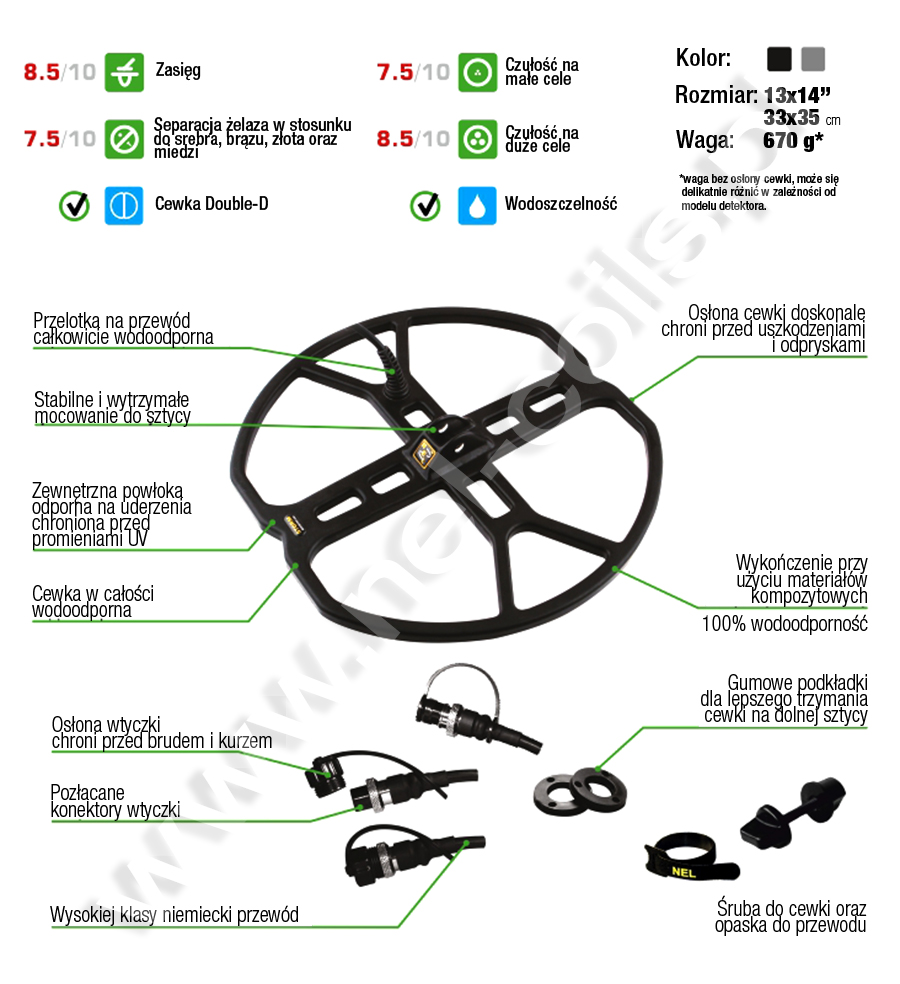 Cewka Nel Storm 13x14 cali. Jest to większa siostra cewki Tornado. Cewka sprawdza się przy dużych, średnich i małych celach, także na gruntach silnie zaśmieconych żelazem. Cewka ta jest głębsza od standardowej cewki o 20% w gruncie , a pole przemiatania wzrasta o ponad 10%. Zaleca się, jako zamiennik dla standardowych cewek. Cewka ta jest zalecana do stosowania w otwartym terenie, korpus wypełniony żywicą epoksydową, dodatkowo pokryty powłoką ochronną. Doskonale radzi sobie w warunkach wysokiego i średniego zasolenia gleby, jest w pełni wodoodporna co umożliwia poszukiwania w wodzie. W zestawie otrzymujemy dedykowaną osłonę sondy. Zalecana dla profesjonalistów i amatorów!!