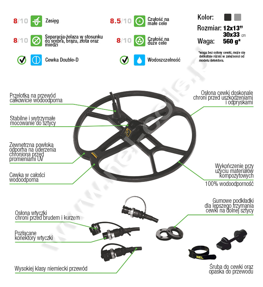 Cewka Nel Tornado 12x13 cali jest najbardziej popularną cewką NEL. Cewka jest niezwykle lekka jak na swój rozmiar, tylko 560 g, dzięki czemu można z nią chodzić nawet cały dzień! Cewka sprawdza się przy dużych, średnich i małych celach, także na gruntach silnie zaśmieconych żelazem. Cewka ta jest głębsza od standardowej cewki o 20% w gruncie , a pole przemiatania wzrasta o ponad 10%. Zaleca się, jako zamiennik dla standardowych cewek. Cewka ta jest zalecana do stosowania w otwartym terenie, korpus wypełniony żywicą epoksydową, dodatkowo pokryty powłoką ochronną. Doskonale radzi sobie w warunkach wysokiego i średniego zasolenia gleby, jest w pełni wodoodporna co umożliwia poszukiwania w wodzie. W zestawie otrzymujemy dedykowaną osłonę sondy. Zalecana dla profesjonalistów i amatorów!!