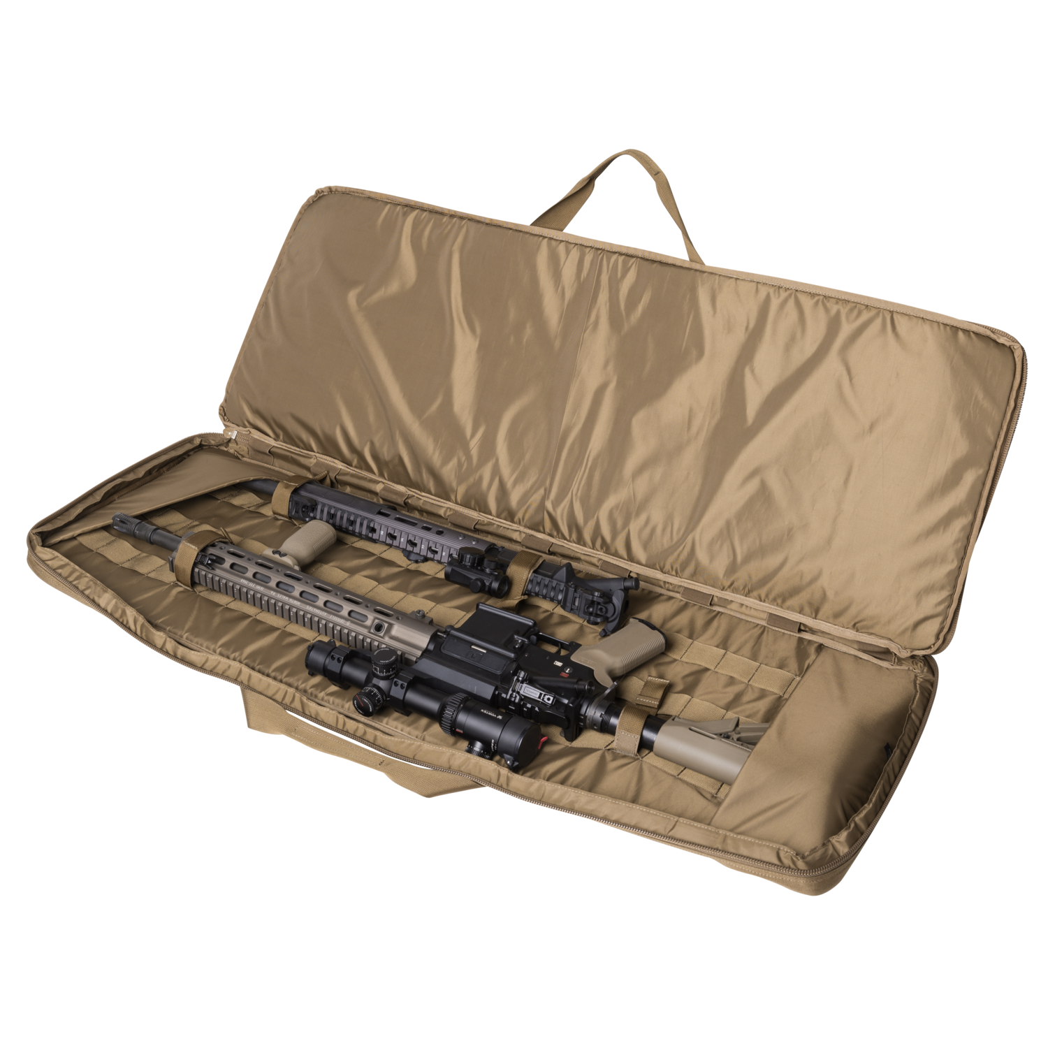 Double Upper Rifle Bag 18® zaprojektowana została tak, by w możliwie kompaktowym formacie, bezpiecznie i wygodnie przenosić karabinek AR w konfiguracji z dwoma lufami z założoną optyką, dwa karabinki AR krótkolufowe lub dwa karabinki AK w podstawowej konfiguracji. Torbę można przenosić za pomocą czterech mocnych uchwytów oraz na rozpinanych i w razie konieczności chowanych do specjalnych kieszeni szelkach. Po zewnętrznej części pokrowca znajdują się trzy duże kieszenie. Każda z nich ma nieco inaczej zaprojektowane wnętrze. W każdej znajdują się: kieszeń zamykana na suwak oraz panele rzepowe przystosowane do zintegrowania z insertami Versatile Insert System®. W zestawie znajduje się: insert na 2 magazynki pistoletowe oraz insert na 5 magazynków do karabinka. Komora główna torby wyposażona jest w system ogniw z taśmy, przez które przewlekać można w dowolnej konfiguracji obejmy velcro przytrzymujące broń. Elastyczne troki zmieszczą wyciory i elementy czyszczące karabinki, a specjalnie zaprojektowane usztywniane kieszenie - ograniczniki - zapobiegną przesuwaniu się broni podczas transportu. Insert na pistolet widoczny na filmie nie jest częścią torby. Można go kupić osobno.