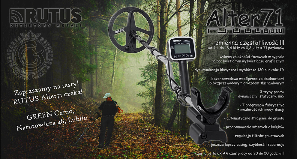 - detektor metali Rutus Alter71 wersja 2.0 z sondą 28cm DD i 12cm CC,