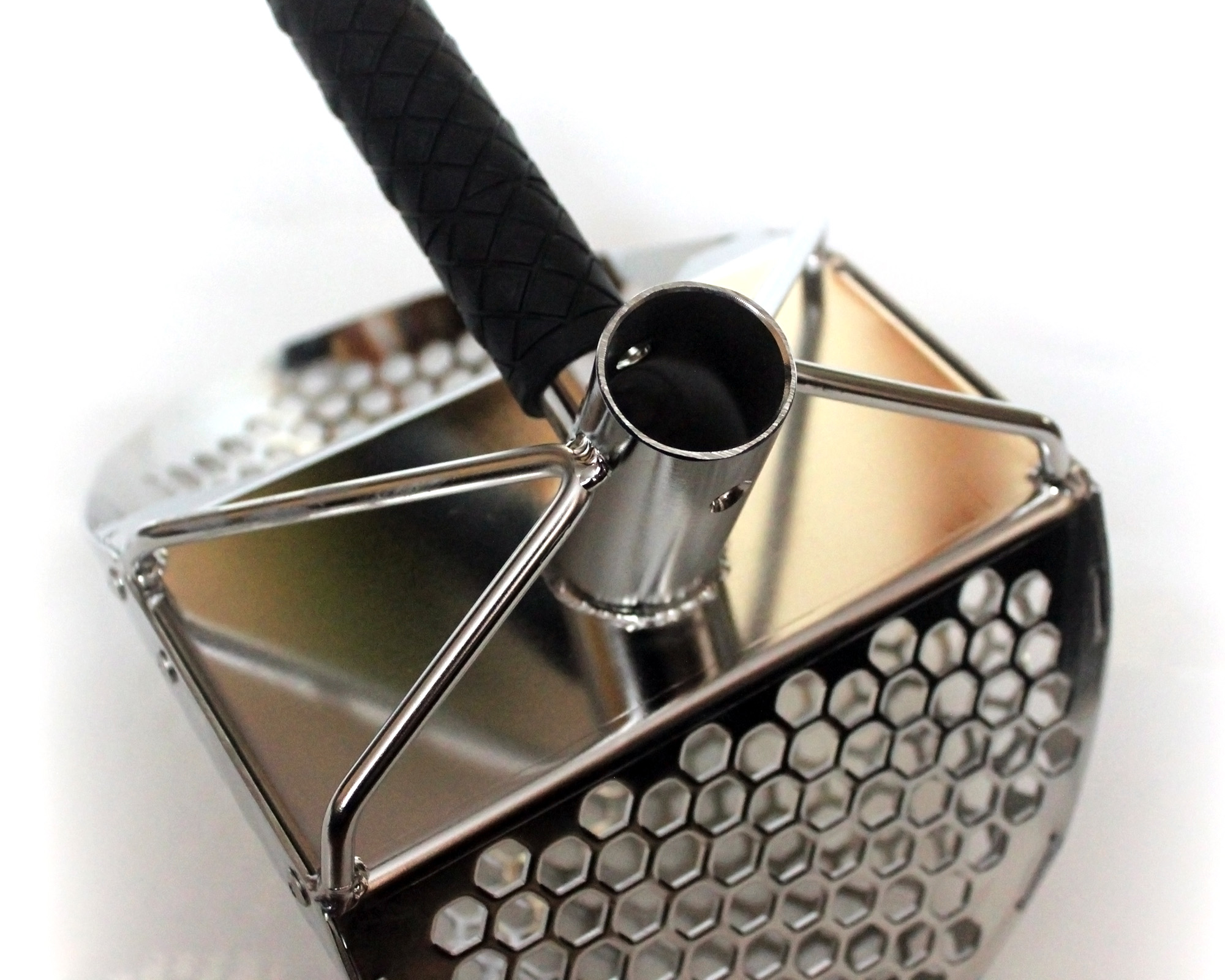 Czerpak sita V2 jest wykonany w przekroju owalnym z powycinanymi sześciokątnymi otworami o wielkości 10mm i posiada 8 krawędzi tnących. Możliwość zamocowania drążka o przekroju 29mm, dzięki któremu nie trzeba się schylać np. brodząc w głębszej wodzie. Sito V2 jest trochę mniejsze i lżejsze do modelu V1.